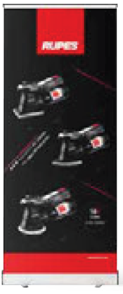 Bannière de sol en PVC avec système d’enroulement.