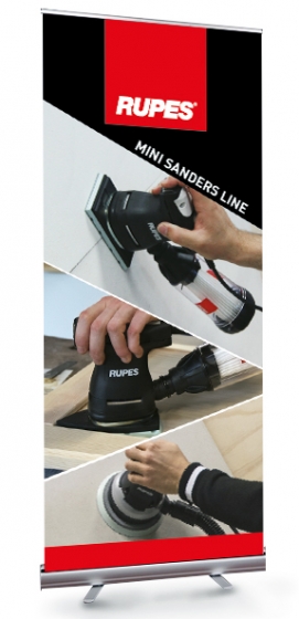 Bannière de sol en PVC avec système d’enroulement.